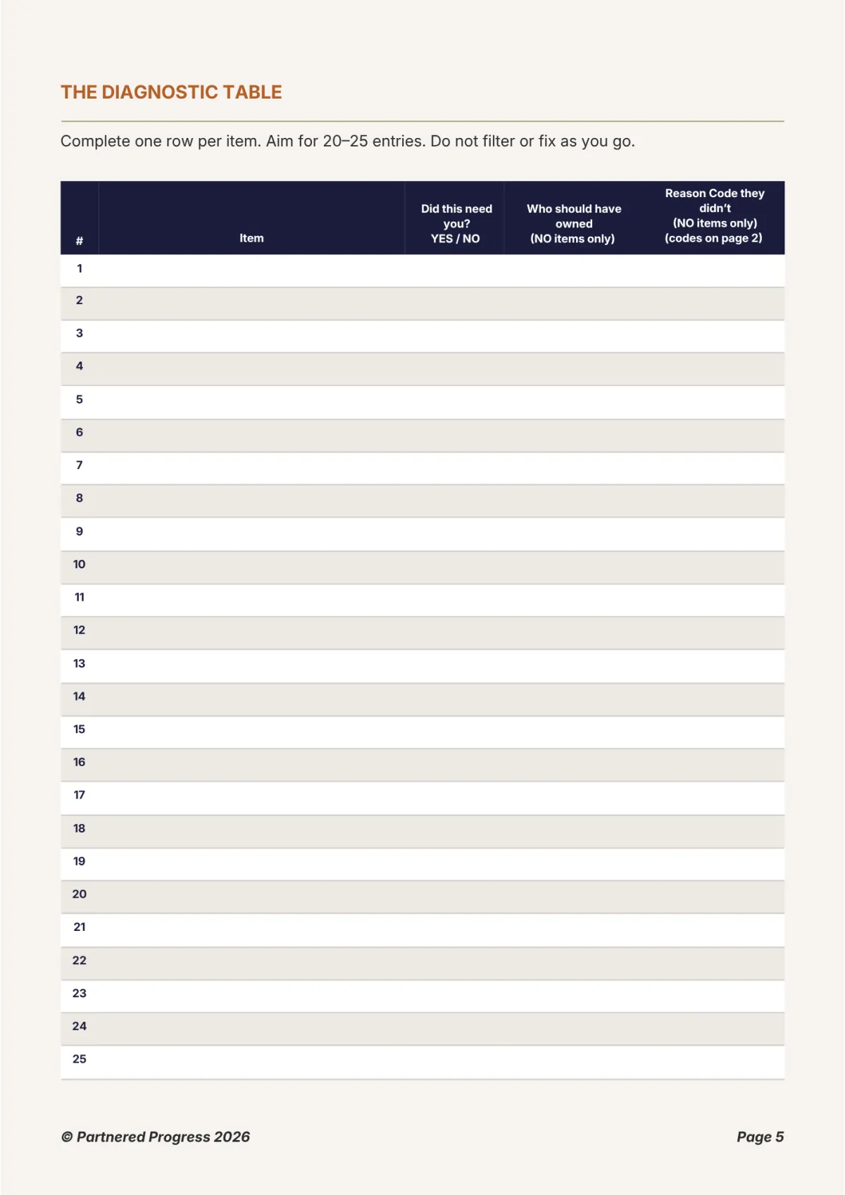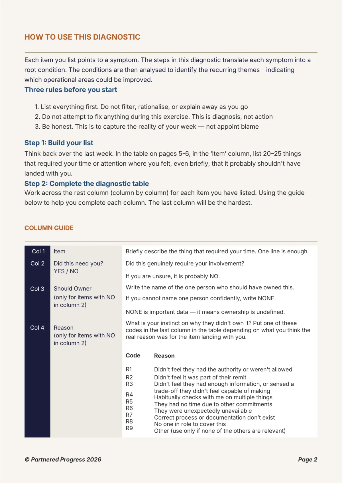 It's deliberately designed to be as easy as possible by making each step have one small and straightforward purpose. That said, businesses are complex systems, so there are complexities in this tool as well. There is some thinking you will need to do but we offer a free Diagnostic Call if you would like support going through the diagnostic or figuring out what to do with the results. This call can be a powerful way to fast track the diagnosis because an expert will guide you through every step, asking the right questions at the right time and removing a lot of the thinking for you. When you download the tool, you'll be able to book the Diagnostic Call.